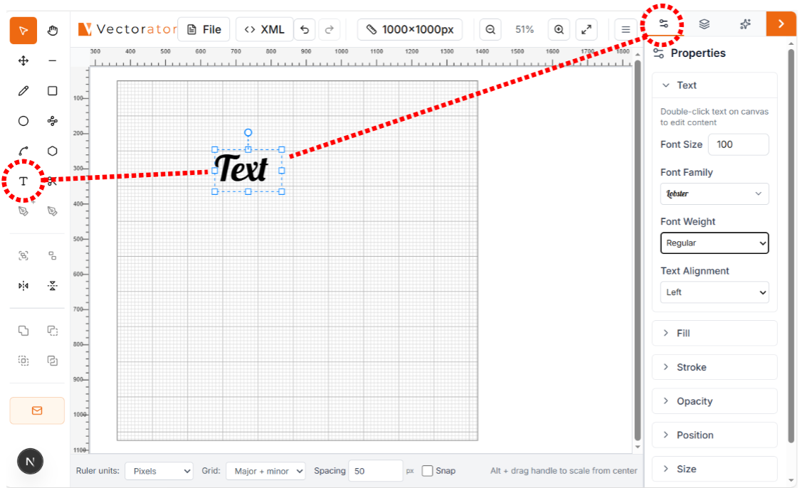 Click the Text tool in the toolbar, then click on your canvas where you want the text. Type your text and adjust the font, size, and style using the properties panel on the right.